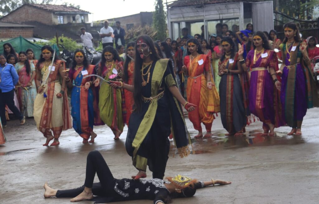 नवरात्र उत्सवामधील मुख्य आकर्षण म्हणजे गरबा दांडिया होय . शहीद वीरपत्नी लक्ष्मी महाविद्यालय तिटवे आयोजित केलेल्या ‘दांडियामध्ये महाविद्यालयाच्या विद्यार्थीनींनी माहोल निर्माण केला .दम मारिया, अंबे अंबे ,ढो ढोल बाजे अशा विविध गाण्यांवर महाविद्यालयाच्या विद्यार्थीनी ठेका धरला होता.घगरा चोली, कुडता अन् दागदागिनेही… दांडियासाठी आधुनिक आणि पारंपरिकतेची सांगड घातली जात आहे. हा बदल अगदी पेहराव दागदागिन्यांच्या प्रकारापासून आहे. या दांडियाच्या परंपरेला साजेसा घागरा चोली, कुडता हा हटके ट्रेंड महाविद्यालयाच्या विद्यार्थीनीच्या मध्ये पाहायला मिळाला. हा सर्व माहोल बघून प्रेक्षकांचे डोळे दिपले.